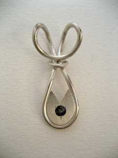 This pendant is a practice in silver for an 18k gold one that I am going to make tomorrow. I call this style a loop pendant, because it starts by soldering a length of wire into a loop. Once soldered, the pendant is then formed. The center stone is a burmese botryoidal tourmaline cabachon provided by gem-faire of New Jersey. The side stones are 4 mm sphenes (titanite). All of the jump rings are 14k gold. All joints of the frame have been soldered to provide strength to this piece. This pendant is available. Price is available upon request. Enjoy. -Andy